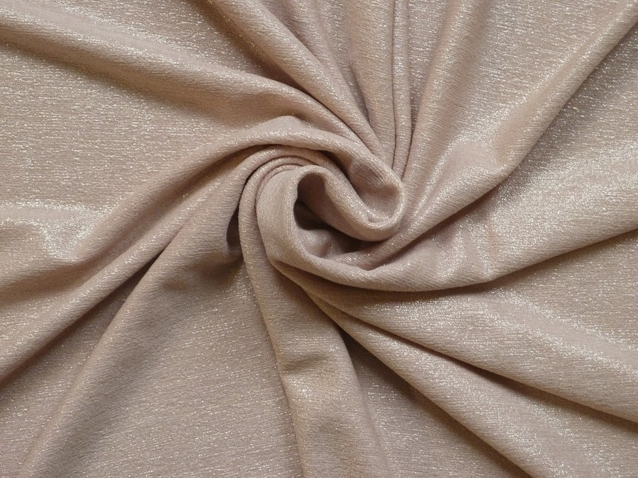Tento luxusně vyhlížející pudrový úplet s jemným metalickým odleskem je dokonalou rovnováhou mezi stylem a pohodlím. Látka má charakteristickou strukturu s drobným žebrováním, která v kombinaci se světlem vytváří krásné odlesky a dodává oděvu hloubku. Vzhledem k jejímu slavnostnímu charakteru a pružnosti se skvěle hodí na večerní a koktejlové šaty (obepnuté i volnější střihy), společenské topy a body, sukně s efektním řasením, či taneční a kostýmové oděvy.
