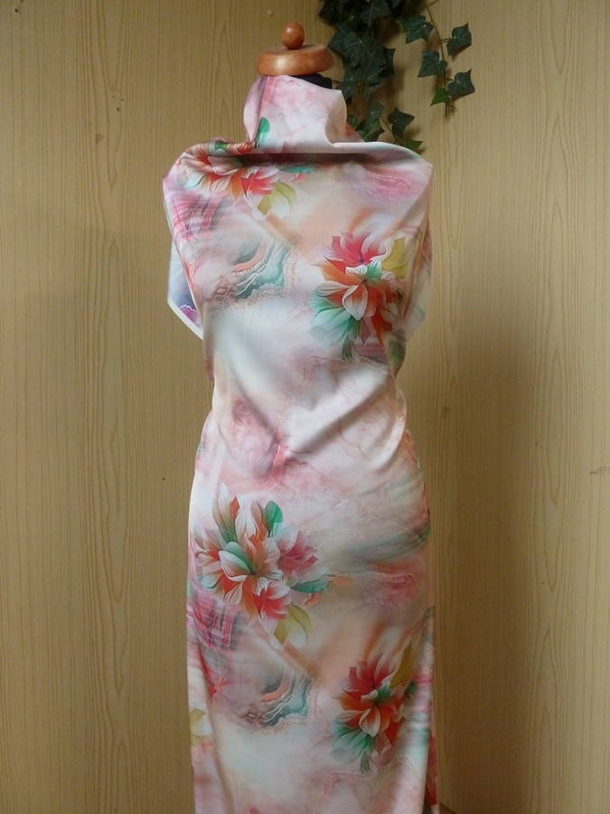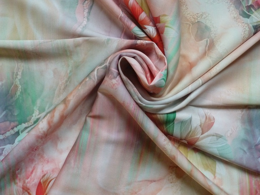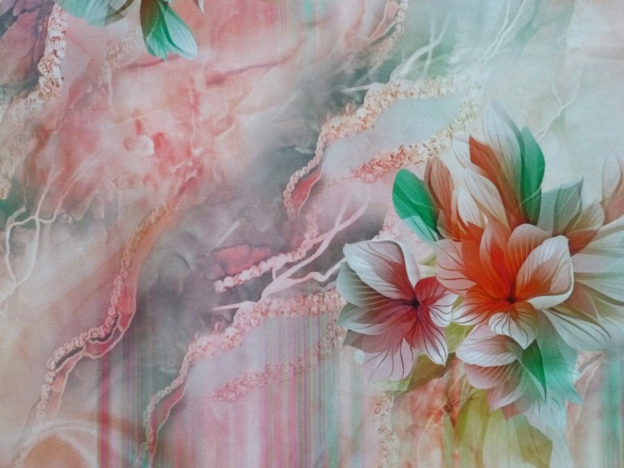 Tato hedvábná šatovka představuje moderní kompozici abstraktního mramorování a realistických květinových motivů. Látka vyniká vysokým leskem, hebkostí na dotek a perfektní splývavostí. Díky digitálnímu tisku jsou barvy syté a detaily precizní. Využití: Šaty, luxusní halenky, šátky nebo společenské sukně.