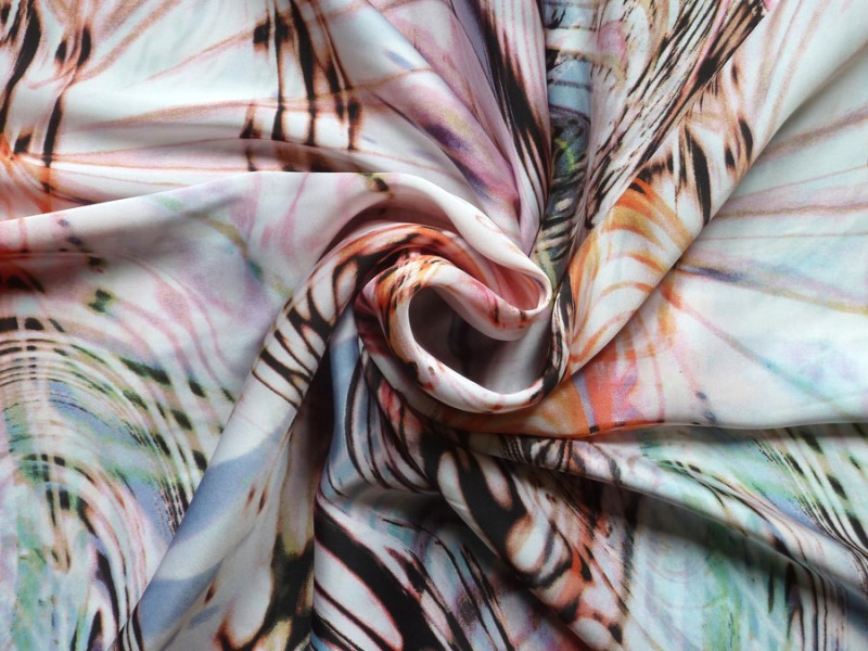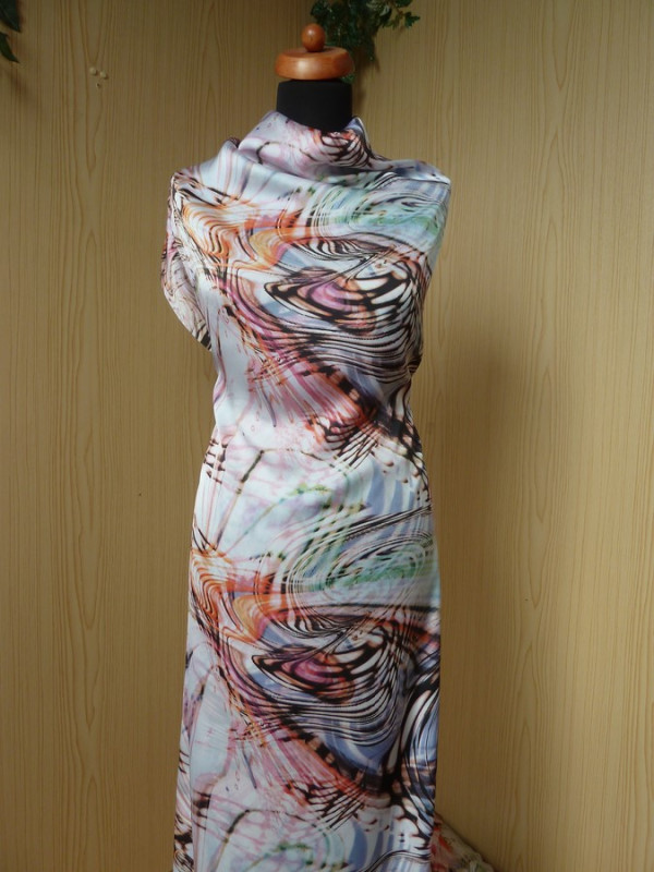 Toto růžové acetátové hedvábí s abstraktním vzorem je splývavé a velmi příjemné na nošení. Má velmi zajímavý vzor, atraktivní kombinaci barev a snadnou údržbu. Je vhodné na šaty, sukně, halenky, košile, volné overaly, tuniky apod.