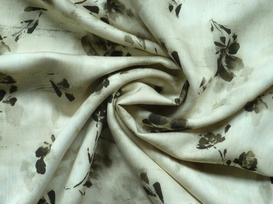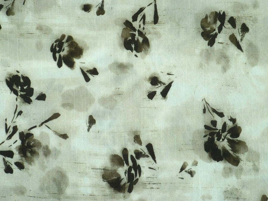 Tato šatová látka s jemným matným leskem a patrnou jemnou vazbou je ideální volbou pro ty, kteří hledají eleganci spojenou s maximálním pohodlím. Nadčasový květinový vzor v tlumených antracitových tónech na zastřeném světle šedém podkladu. Design připomíná jemnou malbu tuší nebo akvarelem. Díky své splývavosti a lehkosti je látka jako stvořená pro vzdušné letní šaty a maxišaty, elegantní halenky a tuniky, široké palácové kalhoty, nebo luxusní šátky či přehozy.