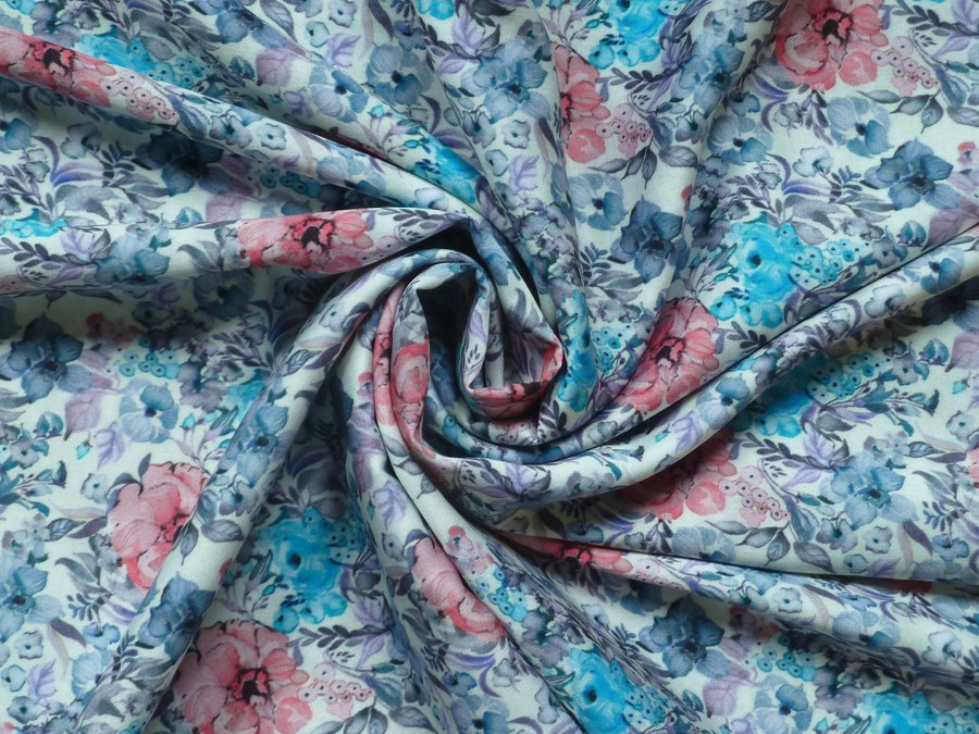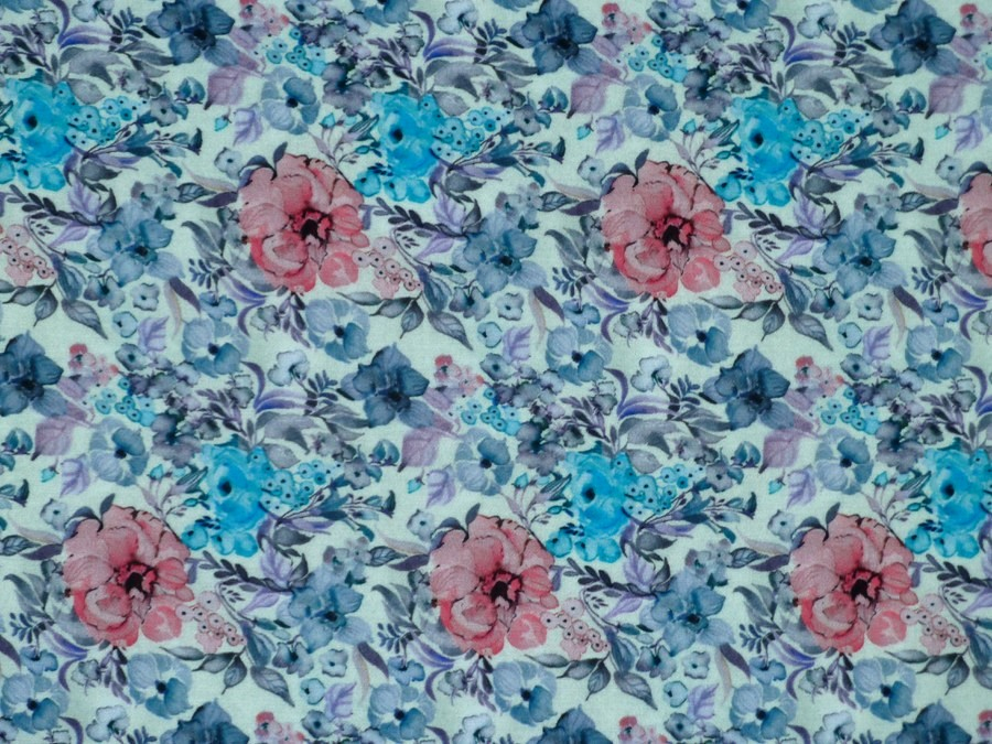 Tato šatovka má jemný květinový motiv v akvarelovém stylu, který působí jako ručně malované umělecké dílo. Materiál je lehký a krásně splývavý, což z něj činí ideální volbu pro bohaté sukně, zavinovací šaty nebo vzdušné halenky.