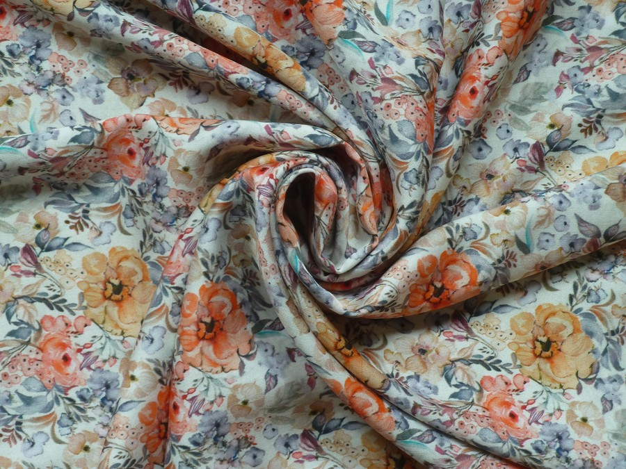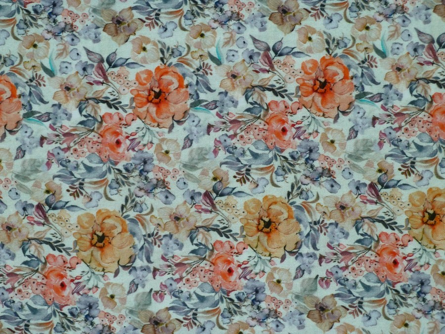 Tato šatovka má jemný květinový motiv v akvarelovém stylu, který působí jako ručně malované umělecké dílo. Materiál je lehký a krásně splývavý, což z něj činí ideální volbu pro bohaté sukně, zavinovací šaty nebo vzdušné halenky.