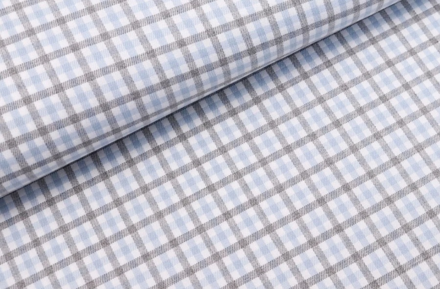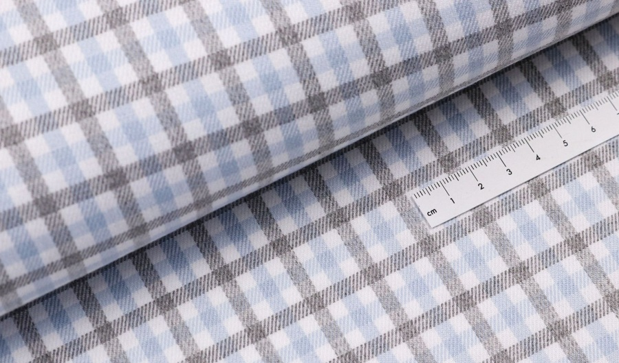 Tato smetanová kostýmovka má šedo modrý kostkovaný vzor. Má atraktivní kombinaci barev. Je splývavá a příjemná na nošení. Je vhodná na sukně, sáčka, kostýmy a šaty či jiné designové kousky.