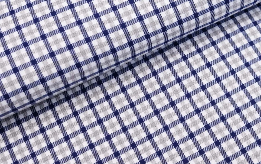 Tato smetanová kostýmovka má šedo modrý kostkovaný vzor. Má atraktivní kombinaci barev. Je splývavá a příjemná na nošení. Je vhodná na sukně, sáčka, kostýmy a šaty či jiné designové kousky.