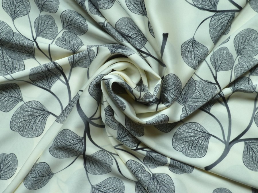 Smetanové acetátové hedvábí s unikátním potiskem skeletových listů v tmavě šedém až antracitovém odstínu je ideální volbou pro ty, kteří hledají luxusní vzhled s praktickými vlastnostmi.  Je ideální pro letní šaty volného střihu, volné halenky, luxusní pyžamové sety nebo designové šátky.