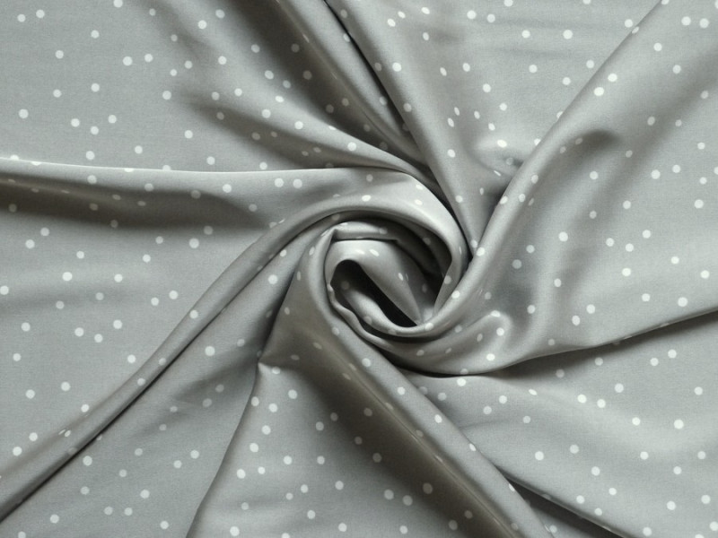 Toto stříbrné acetátové hedvábí s bílými puntíky je splývavé a velmi příjemné na nošení. Má velmi atraktivní vzor a snadnou údržbu. Je vhodné na šaty, sukně, halenky, košile, volné overaly, tuniky apod.
