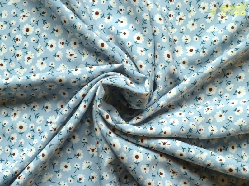 Tato světle modrá viskózová šatovka s drobnými kvítky je splývavá a velmi příjemná na nošení. Má atraktivní potisk a velmi zajímavou kombinaci barev. Je vhodná na letní šaty, sukně, halenky, tuniky, volné letní kalhoty apod.