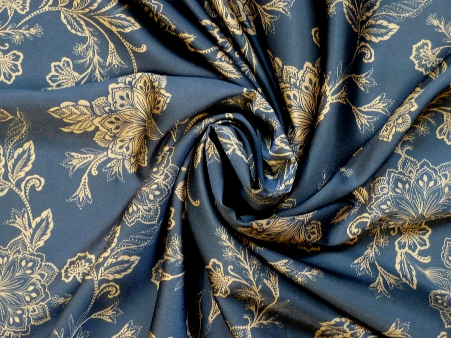 Toto acetátové hedvábí na první pohled zaujme svým bohatým florálním vzorem, který kombinuje jemné linie zlatavých květů s tmavě modrým podkladem. Je to ideální volba pro ty, kteří hledají vzhled a pocit pravého hedvábí, ale vyžadují snazší údržbu. Vzhledem k luxusnímu vzhledu a splývavosti je tato látka jako stvořená pro večerní a společenské šaty, elegantní halenky a topy, či kimona a luxusní domácí oděvy