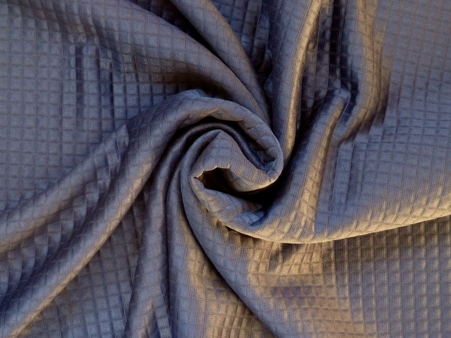 Tmavě modrý úplet s vaflovou texturou. Díky této struktuře látka lépe drží teplo a má dobré izolační vlastnosti. Často se označuje jako termovafle. Tato látka je ideální pro pohodlné, teplé a sportovně-volnočasové oblečení: mikiny a kardigany, volnočasové kalhoty a tepláky, nebo hřejivé šaty a tuniky.