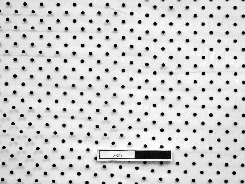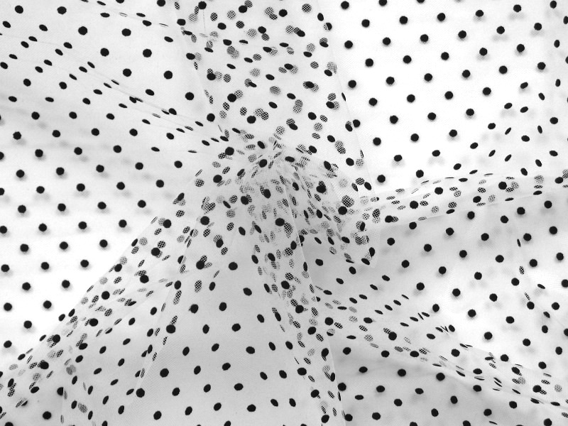 Tyl bílý s černým sametovým puntíkem. tato látka je průhledná s jemným mřížkováním a lepenými aplikacemi. používá se k výrobě dámských šatů, na závoje apod. lze tuto látku využít k mnoha dekoračním účelům např. na slavnostní tabule nebo na záclony apod.