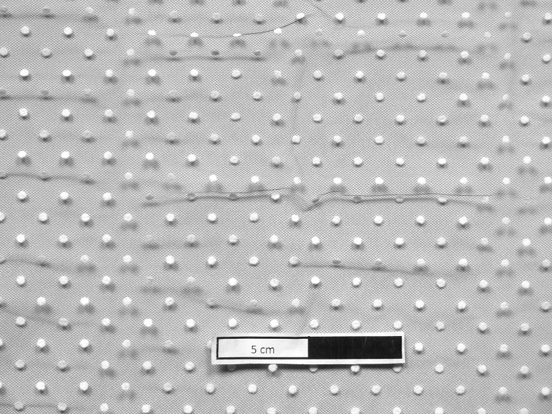 Tyl černý s bílýmy sametovými puntíky. tato látka je průhledná s jemným mřížkováním a lepenými aplikacemi.  používá se k výrobě dámských šatů, na závoje apod. lze tuto látku využít k mnoha dekoračním účelům např. na slavnostní tabule nebo na záclony apod.