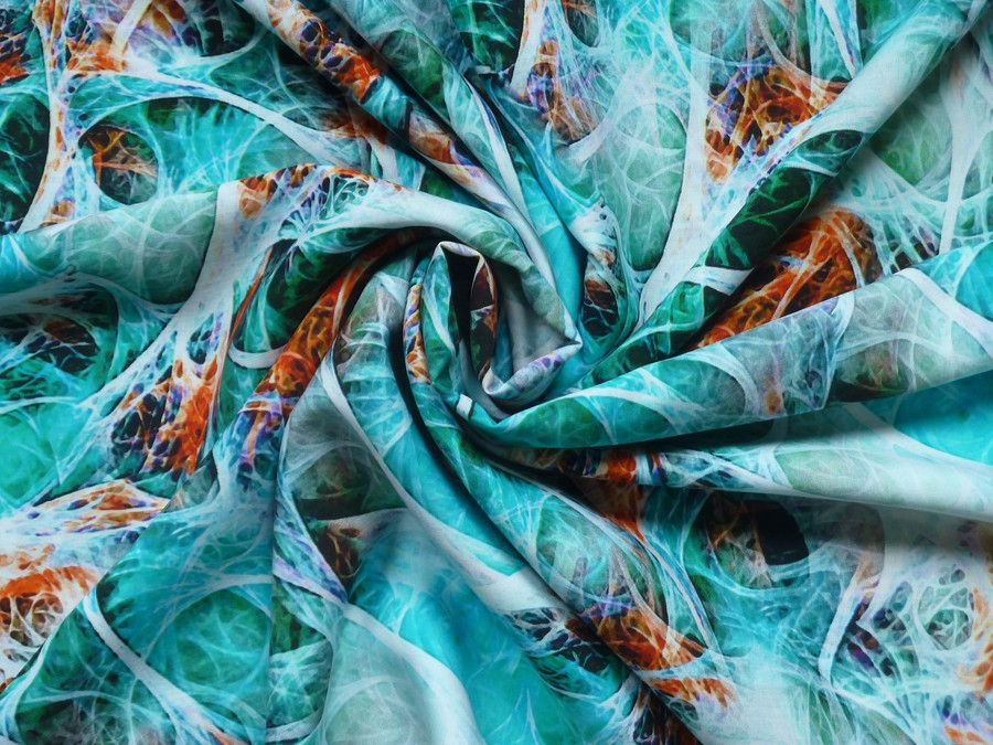 Tato viskozová látka není jen obyčejný potisk, je to umělecké dílo. Díky pokročilé technologii 5D tisku získává vzor neuvěřitelnou hloubku a plasticitu. Design připomíná organické struktury, propletená nervová vlákna nebo snovou ledovou krajinu v kombinaci s ohnivými akcenty. Vzhledem k výraznému vzoru z ní budou vypadat fantasticky zavinovací šaty - vzor se bude krásně lámat v záhybech, maxi sukně - nechte vyniknout plochu tisku při každém kroku, vzdušné tuniky a halenky - skvěle doplní jednobarevné kalhoty, nebo luxusní pyžamové sety.