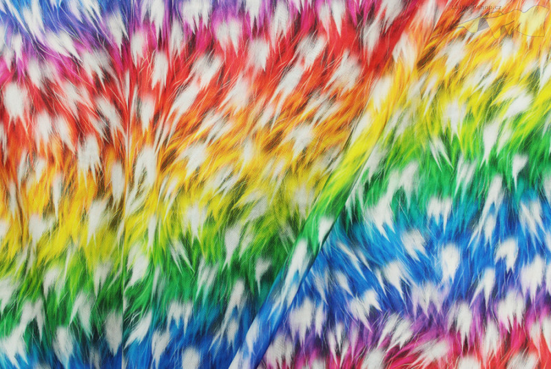 Polyesterový úplet s duhovým vzorem peří je vhodný na šaty, trika, halenky, nebo i na taneční oděvy.