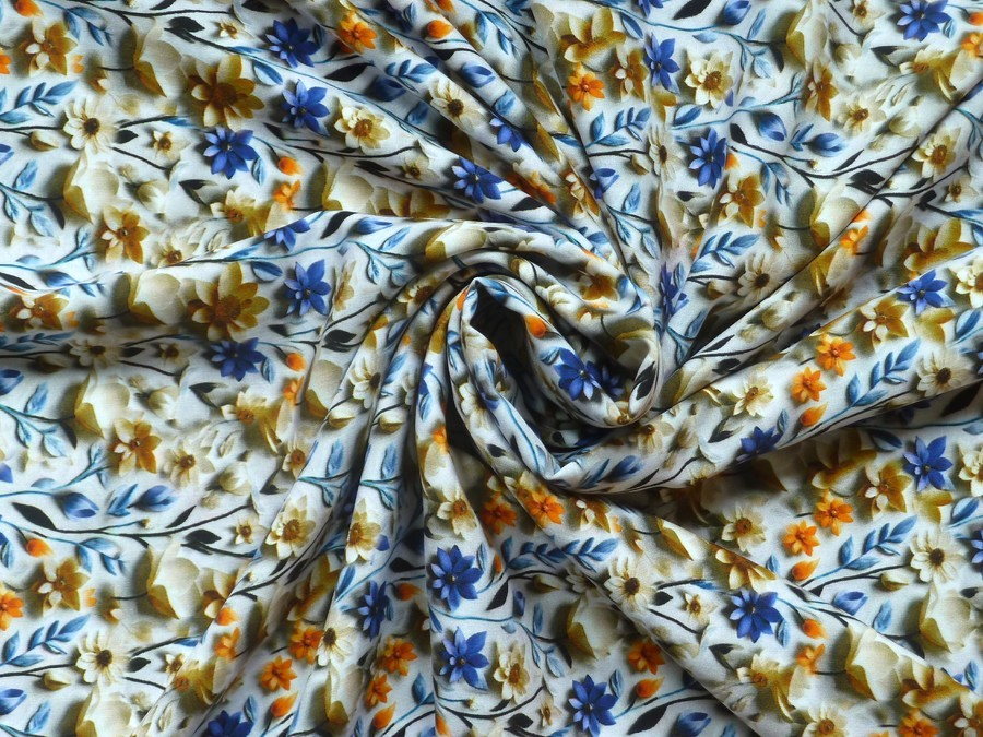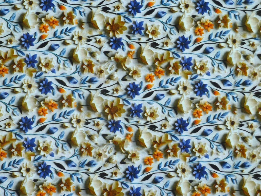 Tato prémiová viskózová šatovka vás okouzlí nejen svým složením, ale především unikátním 5D digitálním tiskem, přičemž vzor vypadá neuvěřitelně plasticky, jako by okvětní lístky vystupovaly přímo z povrchu látky. Kombinace modrých a oranžových lístků na světlém podkladu působí romanticky a svěže. Látka je lehká, jemná a má přirozený, elegantní pád. Je ideální na modely, které se v pohybu krásně vlní: zavinovací šaty a maxi šaty, vzdušné letní sukně, elegantní halenky a tuniky, nebo široké kalhoty typu palazzo.