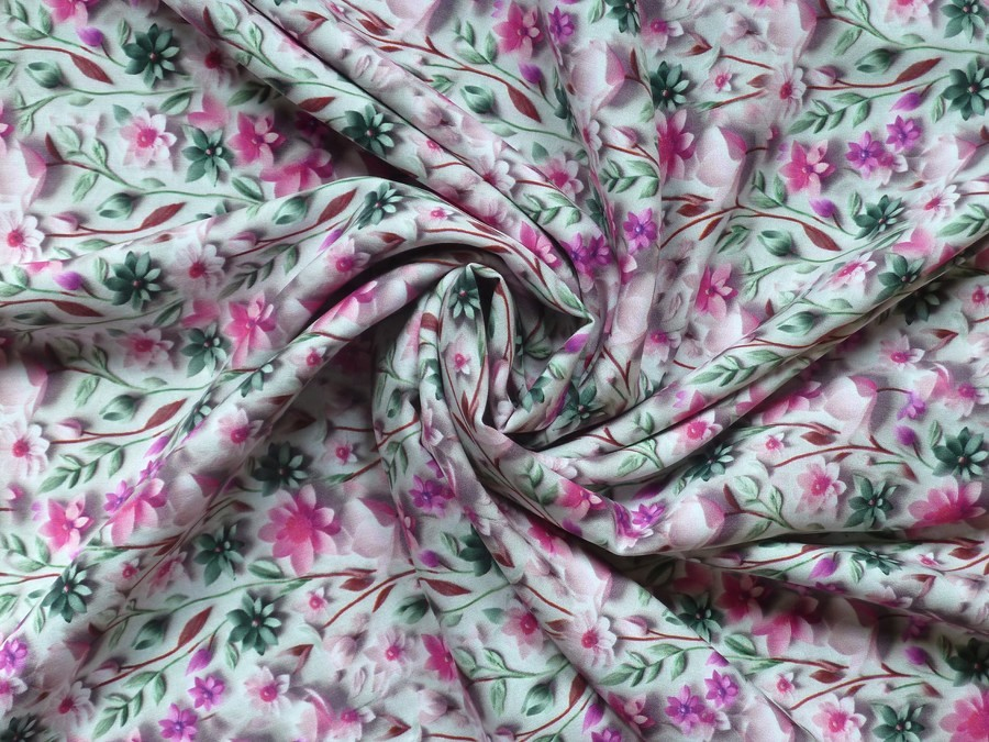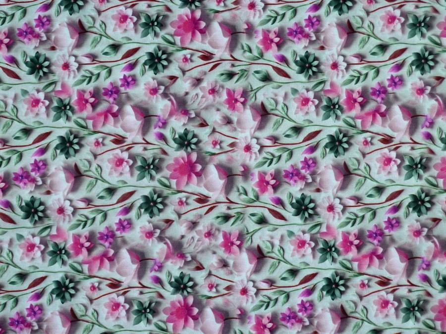 Tato prémiová viskózová šatovka vás okouzlí nejen svým složením, ale především unikátním 5D digitálním tiskem, přičemž vzor vypadá neuvěřitelně plasticky, jako by okvětní lístky vystupovaly přímo z povrchu látky. Kombinace svěžích růžových tónů a šalvějově zelených lístků na světlém podkladu působí romanticky a svěže. Látka je lehká, jemná a má přirozený, elegantní pád. Je ideální na modely, které se v pohybu krásně vlní: zavinovací šaty a maxi šaty, vzdušné letní sukně, elegantní halenky a tuniky, nebo široké kalhoty typu palazzo.