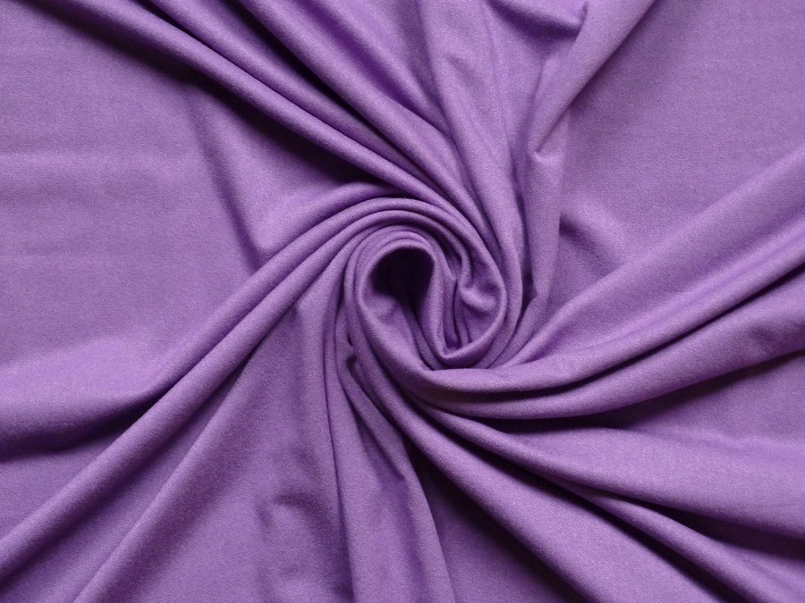 Tento viskózový úplet v barvě lila s příměsí spandexu je definicí lehkosti a elegance. Díky vysokému podílu viskózy je látka přirozeně chladivá, prodyšná a má nádherný, jemně hedvábný lesk. Látka je krásně poddajná, pružná v obou směrech, netvoří tuhé záhyby a elegantně kopíruje postavu.Je vhodná na šaty, sukně, zavinovací topy, lehké kardigany, pyžama nebo dětské oblečení.