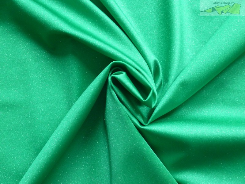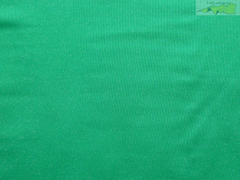 Tato zelená neprůhledná, oboustranně elastická látka s jemným třpytem má vysoký obsah spandexu. Je vhodná na fitness leginy, úbory, trikoty, plavky apod.