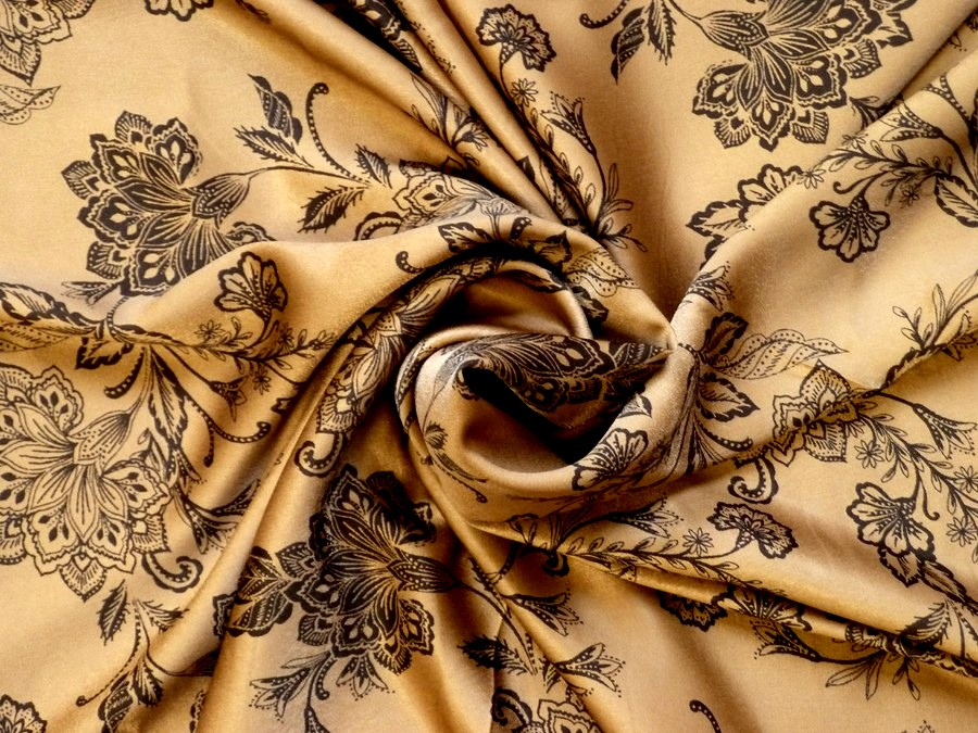 Toto acetátové hedvábí na první pohled zaujme svým bohatým florálním vzorem, který kombinuje jemné linie černých květů se zlatavým podkladem. Je to ideální volba pro ty, kteří hledají vzhled a pocit pravého hedvábí, ale vyžadují snazší údržbu. Vzhledem k luxusnímu vzhledu a splývavosti je tato látka jako stvořená pro večerní a společenské šaty, elegantní halenky a topy, či kimona a luxusní domácí oděvy