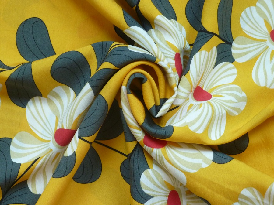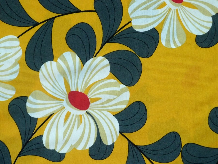 Lněná směs s viskózou: Retro květy na žluté. Tato šatovka kombinuje přirozenou strukturu lnu s jemností a splývavostí viskózy. Výsledkem je materiál, který je prodyšný, příjemný na tělo a mnohem méně se mačká než čistý len.